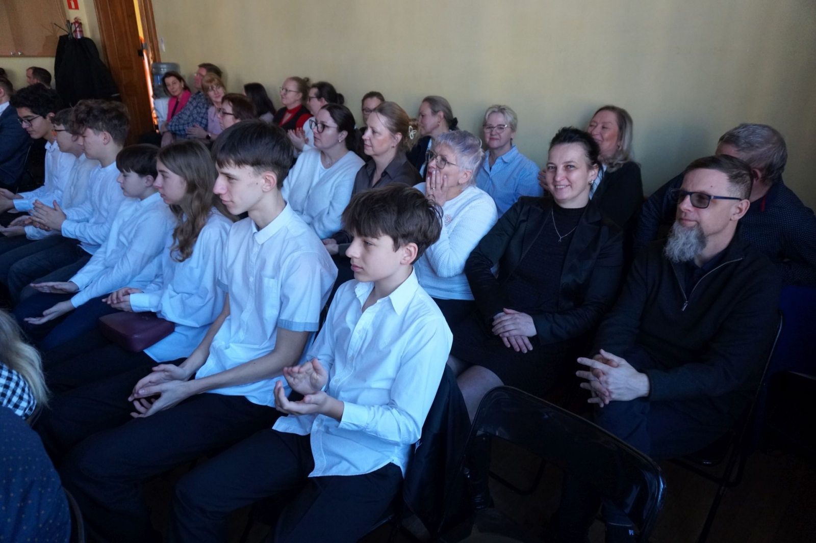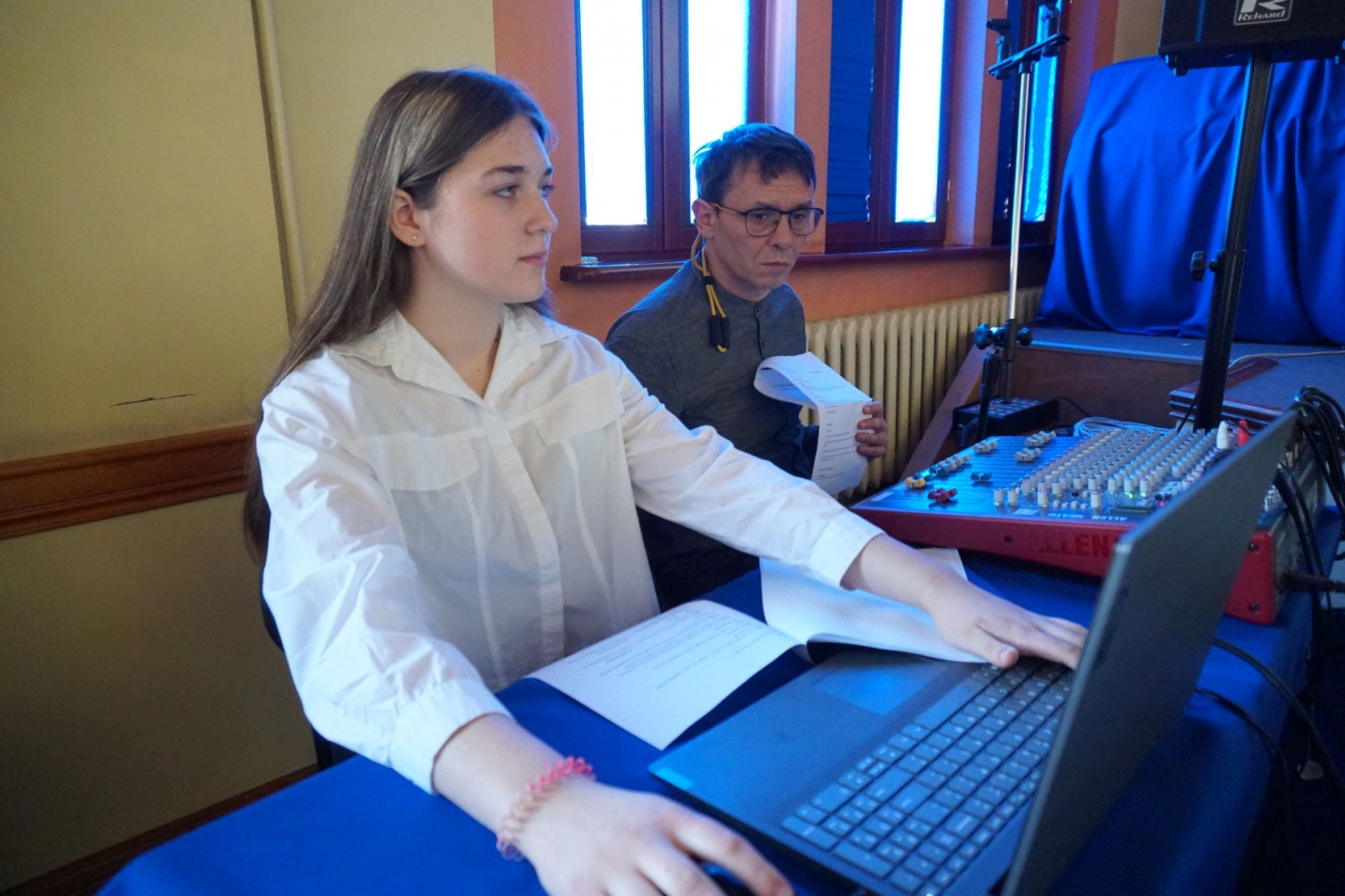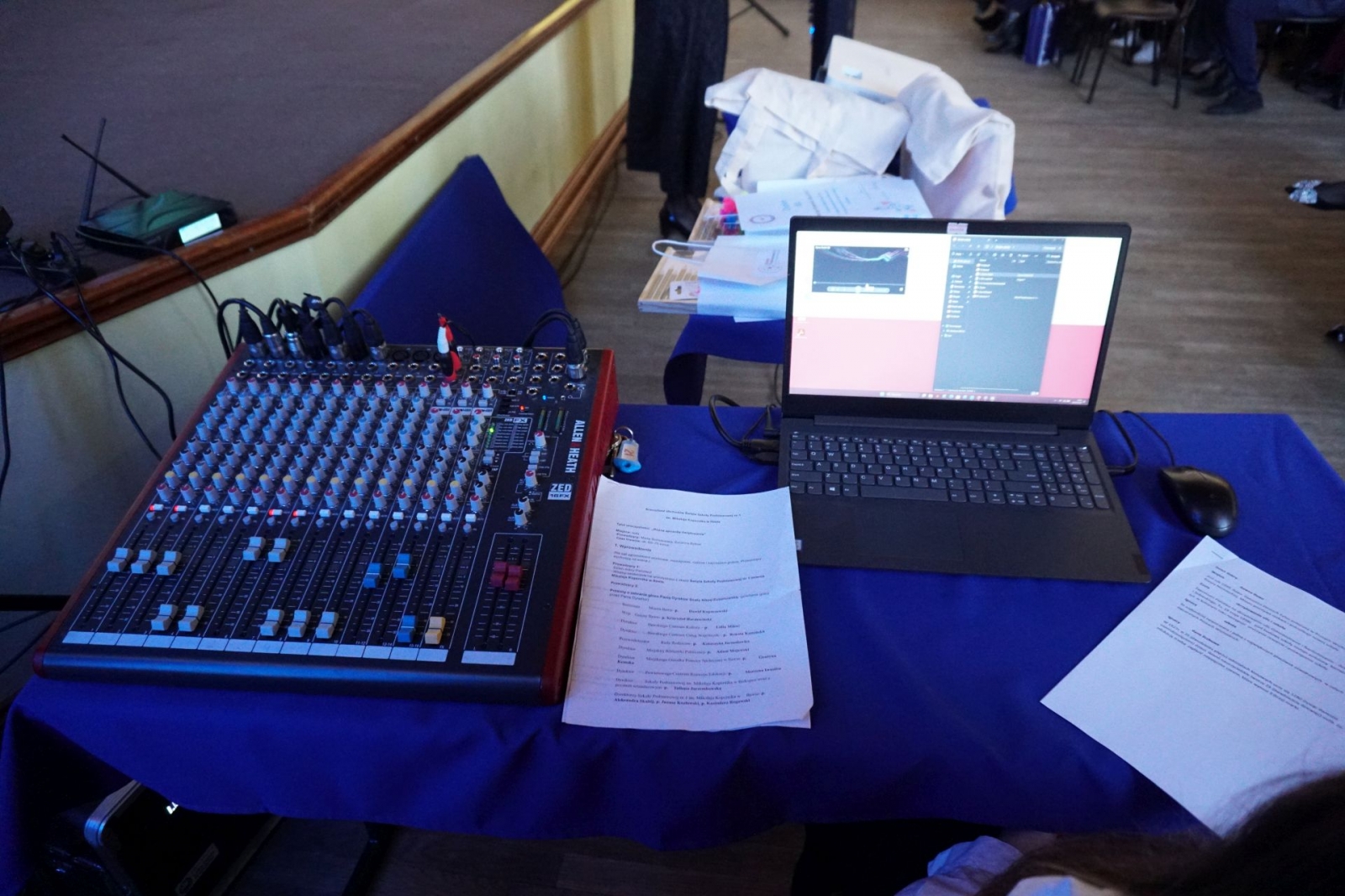 Święto szkoły bez poczucia humoru? Nie w iławskiej Jedynce! Tu grupa tuż przed wejściem na scenę w auli (Fot. Mateusz Partyga.)