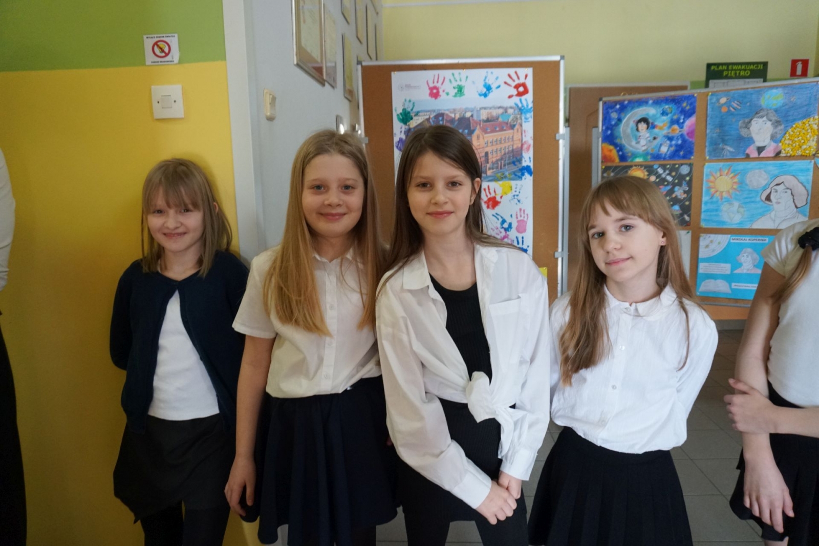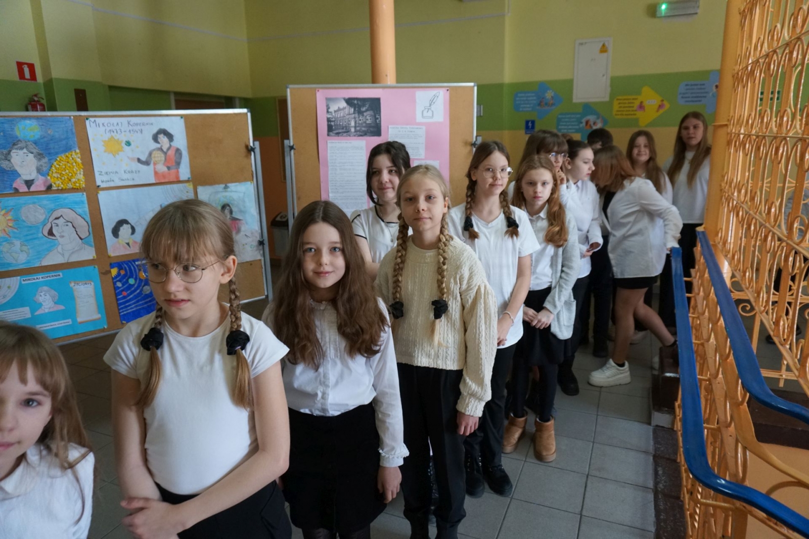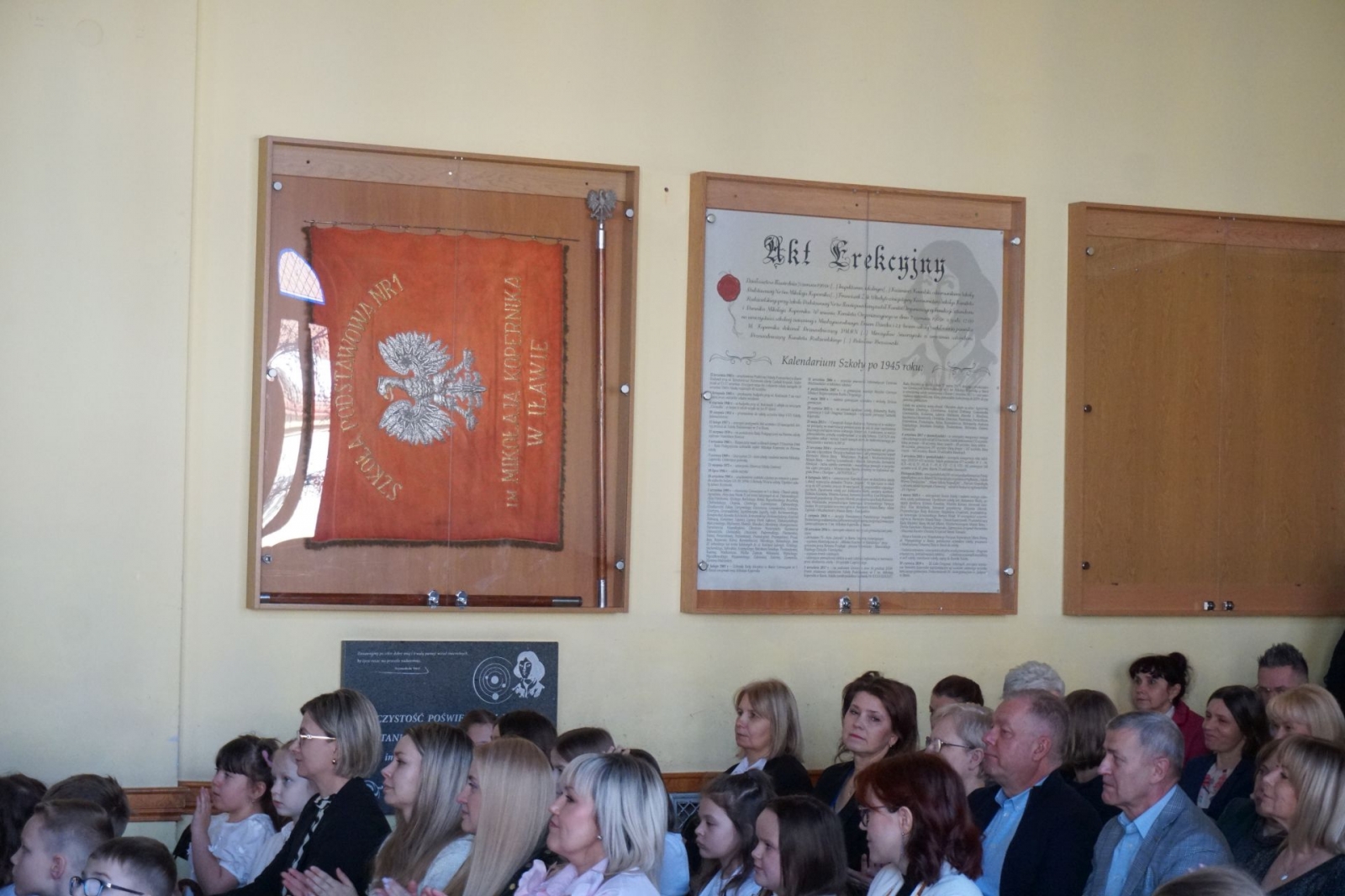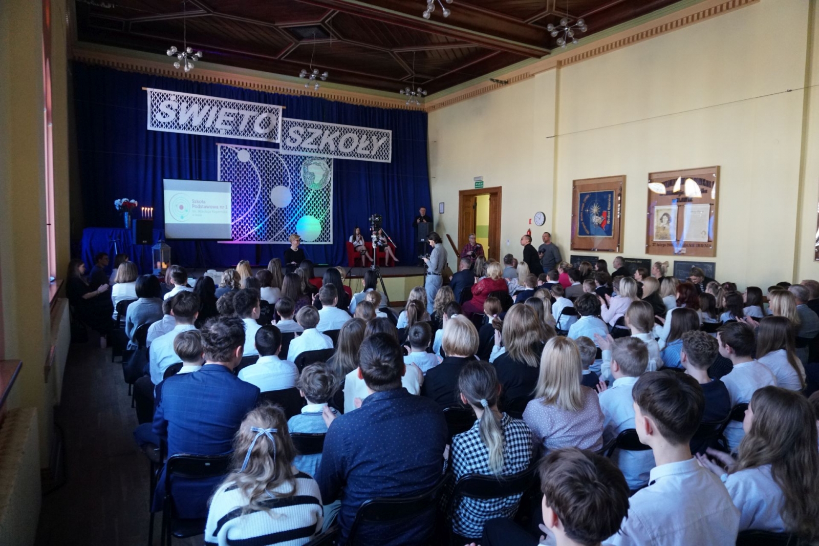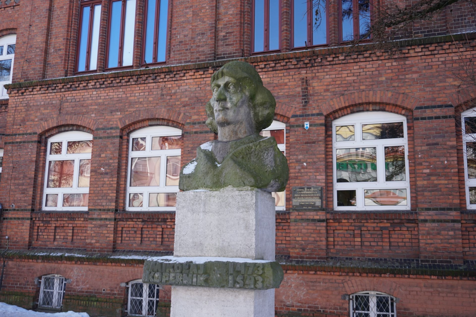 Gdy trwała część oficjalna, udaliśmy się wraz z kolejnym pocztem złożonym z uczniów SP1 pod pomnik patrona szkoły, Mikołaja Kopernika, który stoi tuż przed budynkiem i jest dobrze widoczny z drogi krajowej nr 16. Poza tym, jego podobizna na dzisiejszą uroczystość pojawiła się także na zachodniej ścianie Jedynki, od strony ul. Królowej Jadwigi. Po złożeniu kwiatów - szybki powrót do auli, gdzie trwały kolejne występy. Zajrzeliśmy też do szkolnych kronik.