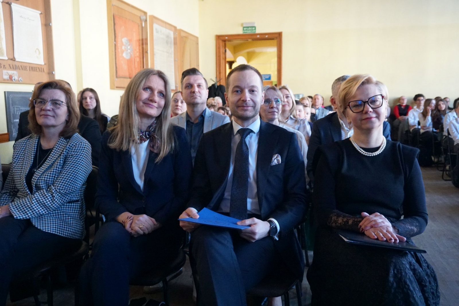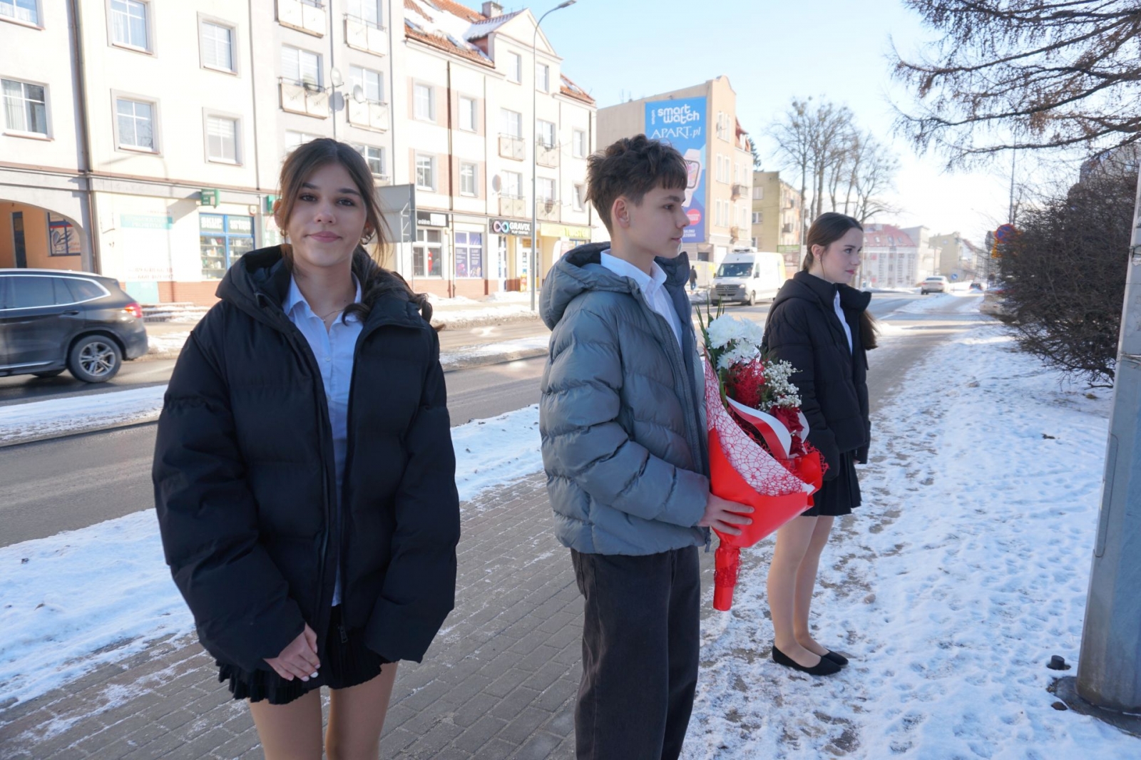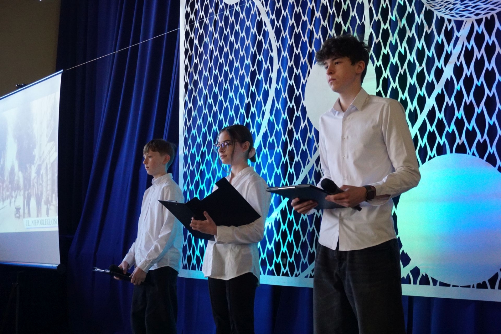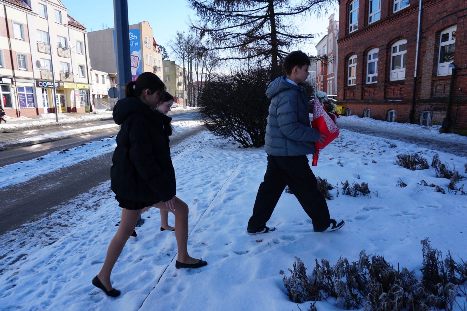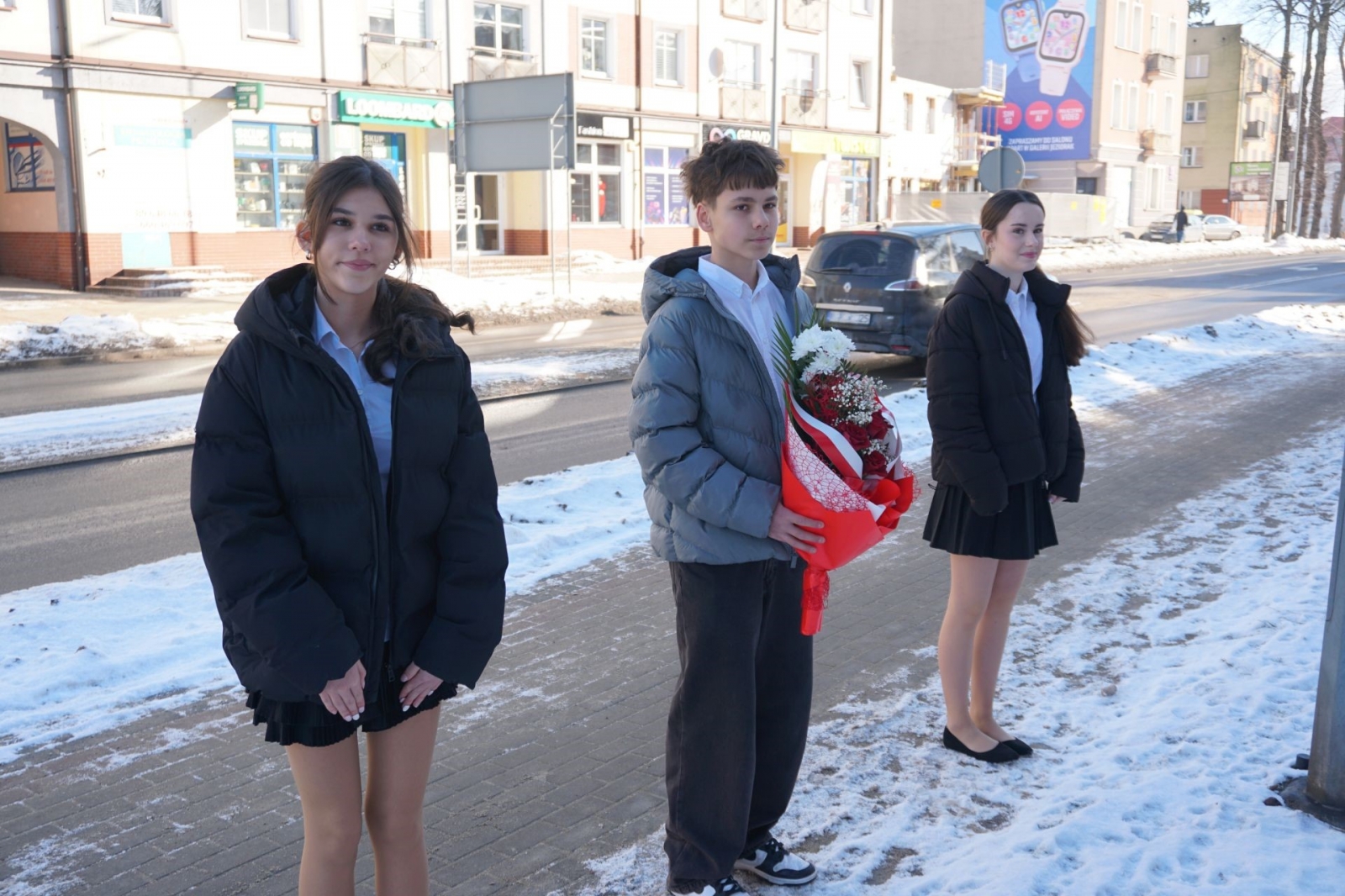 Gdy trwała część oficjalna, udaliśmy się wraz z kolejnym pocztem złożonym z uczniów SP1 pod pomnik patrona szkoły, Mikołaja Kopernika, który stoi tuż przed budynkiem i jest dobrze widoczny z drogi krajowej nr 16. Poza tym, jego podobizna na dzisiejszą uroczystość pojawiła się także na zachodniej ścianie Jedynki, od strony ul. Królowej Jadwigi. Po złożeniu kwiatów - szybki powrót do auli, gdzie trwały kolejne występy. Zajrzeliśmy też do szkolnych kronik.