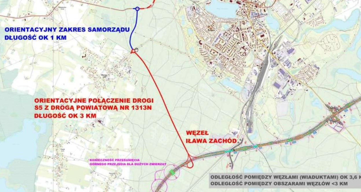- Wstępna lokalizacja dodatkowego węzła (Iława Zachód) to ok. 3,6 km od zaprojektowanego w STEŚ (Studium techniczno-ekonomiczno-środowiskowym - przyp. red.) węzła Iława Południe, który planowany jest w pobliżu granicy administracyjnej Iławy – wyjaśnia w odpowiedzi na pytanie portalu www.infoilawa.pl Marcin Pokojski, dyrektor GDDKiA w Olsztynie. - Załączona mapka jest poglądowa, szczegółowe rozwiązania będą na kolejnym etapie prac projektowych – dodaje.