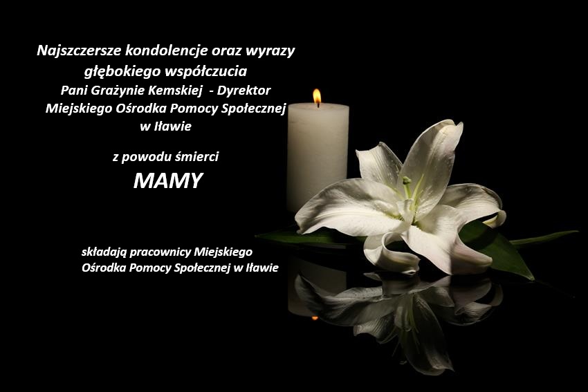 Pani Grażynie Kemskiej - Dyrektor Miejskiego Ośrodka Pomocy Społecznej w Iławie, najszczersze kondolencje oraz wyrazy głębokiego współczucia z powodu śmierci Mamy składają pracownicy Miejskiego Ośrodka Pomocy Społecznej w Iławie.