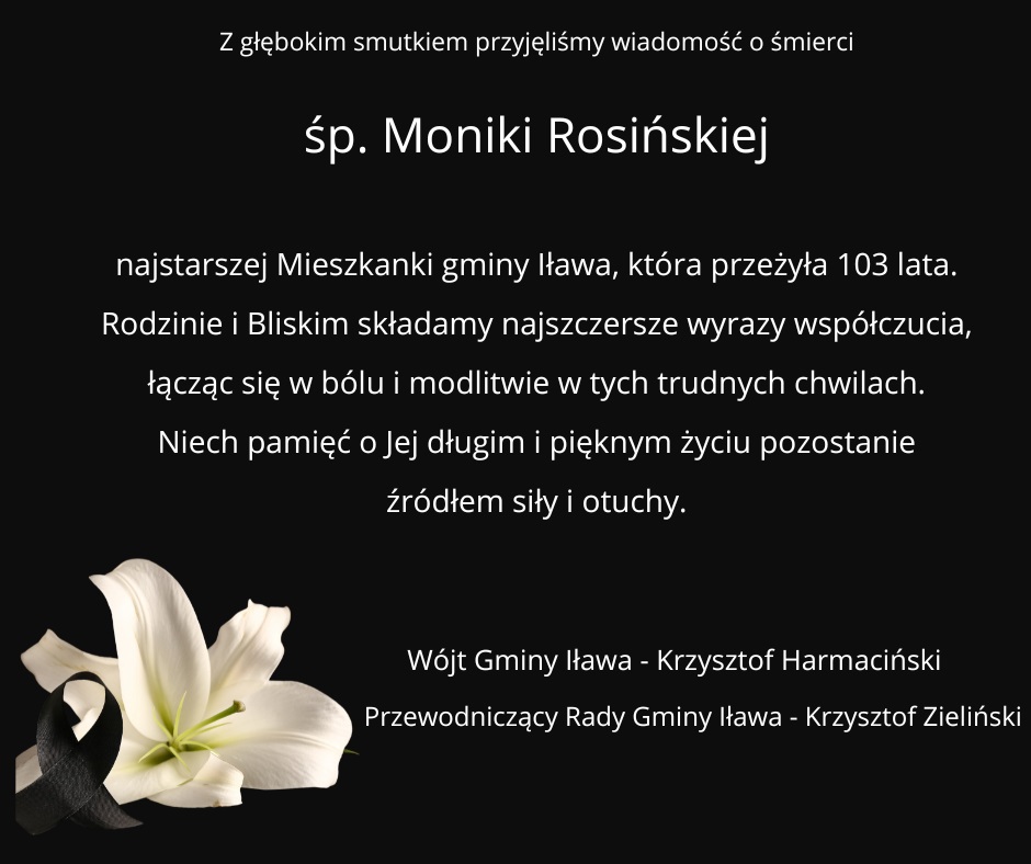 "Niech pamięć o Jej długim i pięknym życiu pozostanie źródłem siły i otuchy" - Wójt Gminy Iława Krzysztof Harmaciński wraz z pracownikami Urzędu Gminy w Iławie oraz Przewodniczący Rady Gminy Iława Krzysztof Zieliński wraz z radnymi i sołtysami składają najszczersze wyrazy współczucia Rodzinie i Bliskim zmarłej śp. MONIKI ROSIŃSKIEJ. Była ona najstarszą mieszkanką Gminy Iława. Odeszła 1 marca, przeżywszy 103 lata.