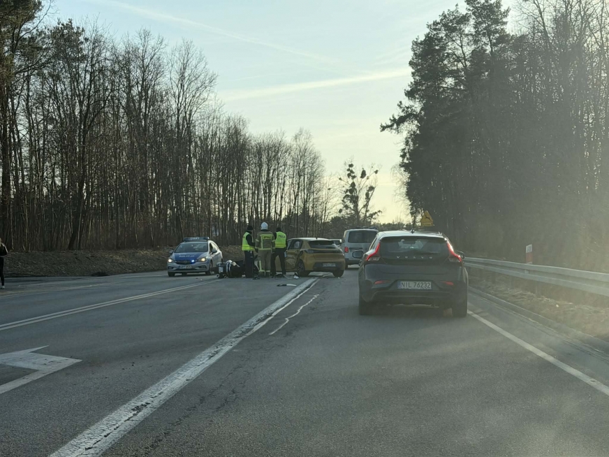 Według wstępnych informacji w wypadku brały udział samochód osobowy oraz motocyklista. Kierujący jednośladem mężczyzna doznał urazu kończyn dolnych. Na miejsce skierowano służby ratunkowe, które prowadzą działania oraz zabezpieczają teren zdarzenia.