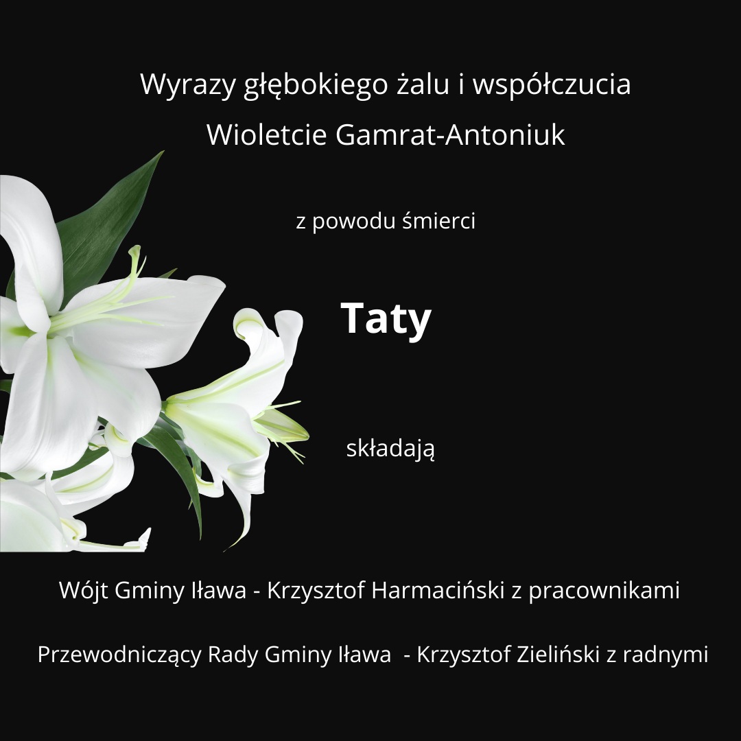 Pani Wioletcie Gamrat-Antoniuk wyrazy głębokiego żalu i współczucia z powodu śmierci śp. Taty składają Wójt Gminy Iława Krzysztof Harmaciński wraz z pracownikami Urzędu Gminy w Iławie oraz Przewodniczący Rady Gminy Iława Krzysztof Zieliński wraz z radnymi.