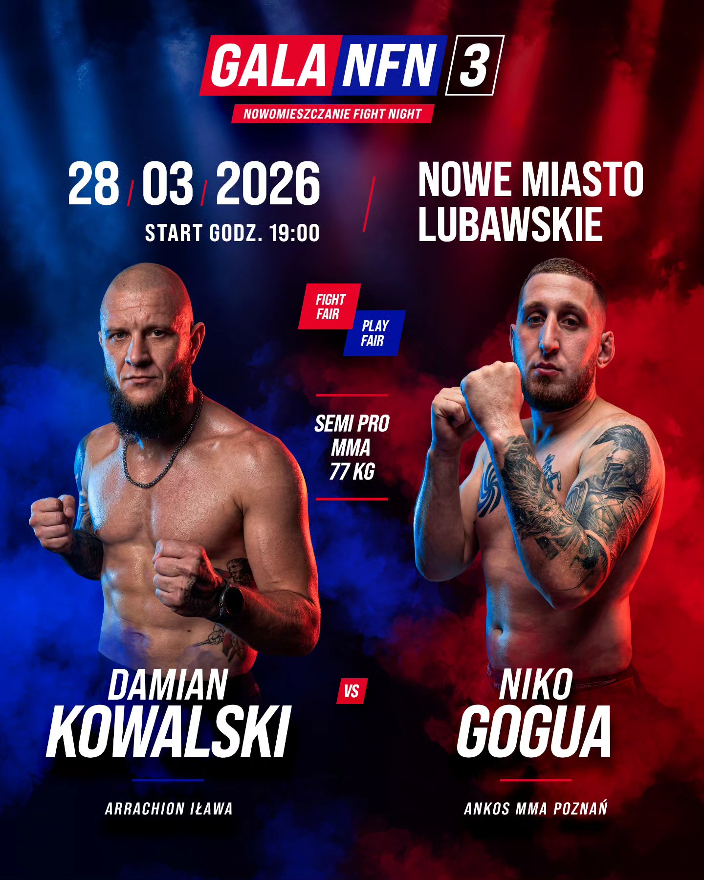 „Przed nami bardzo mocne zestawienie w SEMI PRO MMA, gdzie technika parterowa zderzy się z elitarnymi zapasami. To walka, która może rozstrzygnąć się w każdym obszarze klatki.” - tak o pojedynku Iławianina Damiana Kowalskiego z Gruzinem Niko Goguą (Ankos MMA Poznań) piszą organizatorzy gali mieszanych sztuk walki NFN, której trzecia edycja w sobotę 28 marca odbędzie się w Nowym Mieście Lubawskim. Poza Kowalskim Arrachion Iława będzie tam reprezentowany przez jeszcze dwóch zawodników: Krystiana Sikorskiego i Pawła Kendziorskiego.