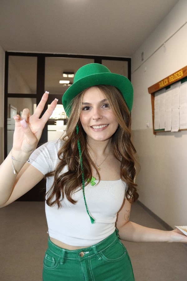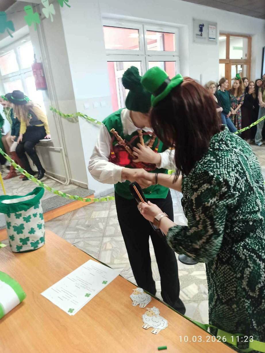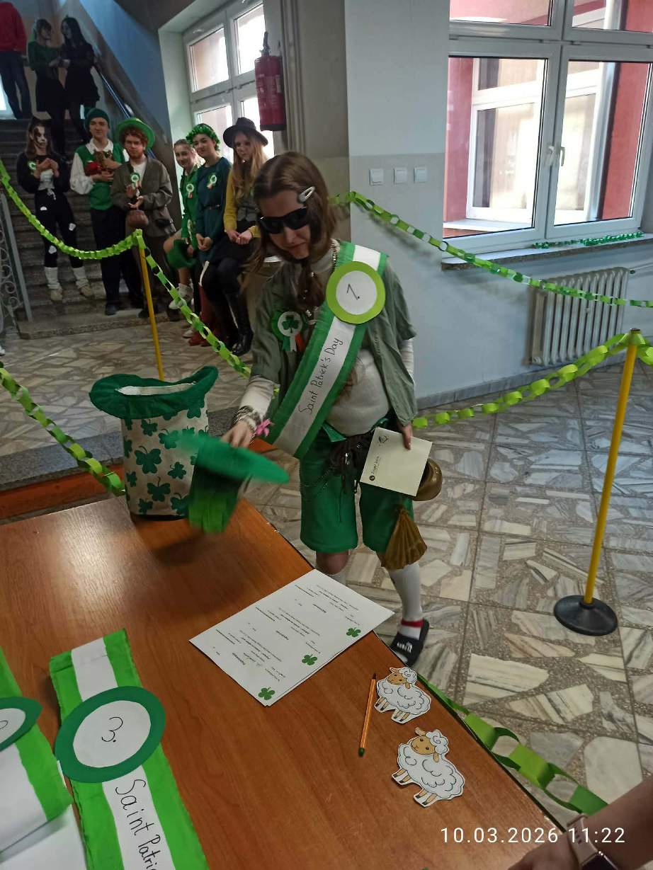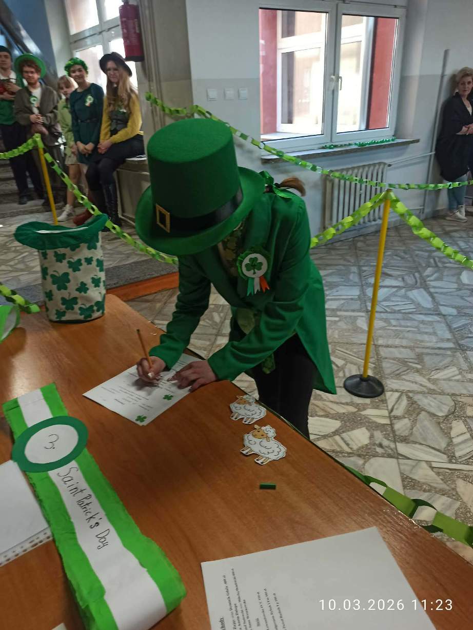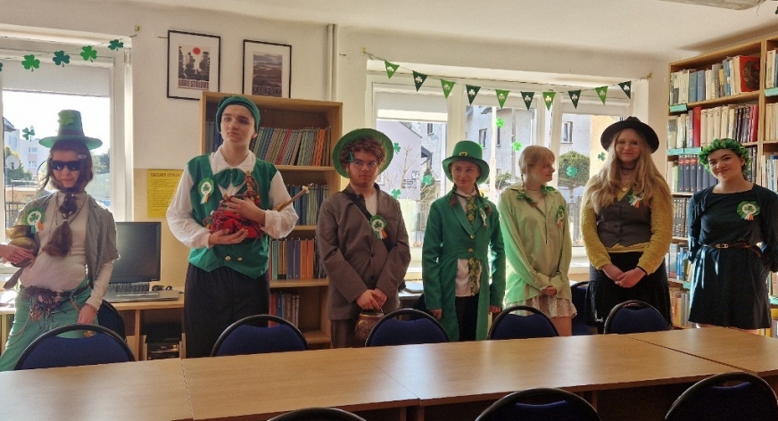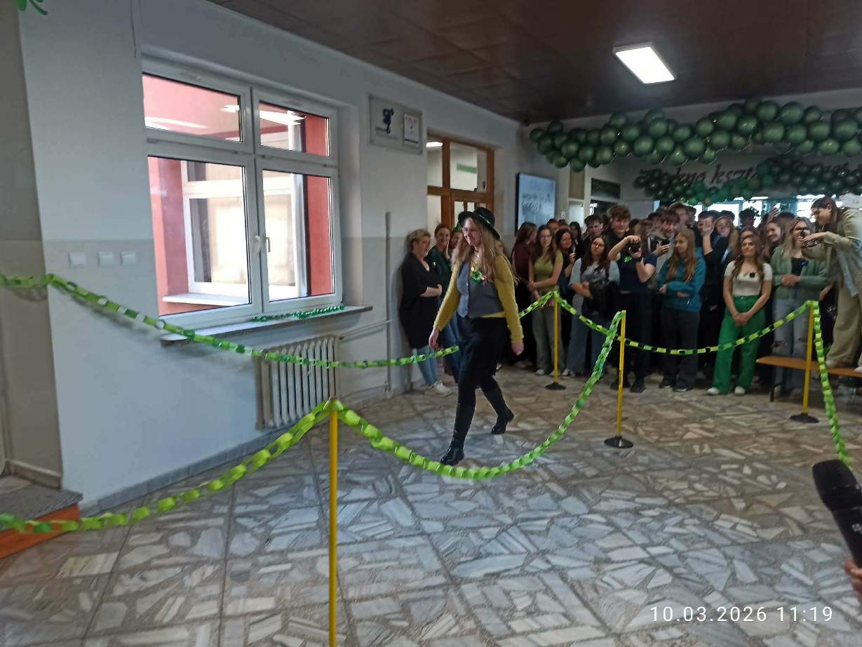 W szkolnej czytelni odbył się konkurs na najlepszy strój inspirowany kulturą irlandzko-celtycką. Uczniowie zaprezentowali dopracowane i różnorodne kreacje, nawiązujące zarówno do tradycji, jak i symboliki Irlandii. Jury oceniało wygląd i sposób prezentacji postaci. W tym roku wsparciem dla komisji była specjalna aplikacja przygotowana przez uczniów klasy programistycznej. Najwyżej oceniono Julię Lewandowską z klasy 4c. Drugie miejsce zajęła Małgorzata Rybak, a trzecie Paweł Rudnik.