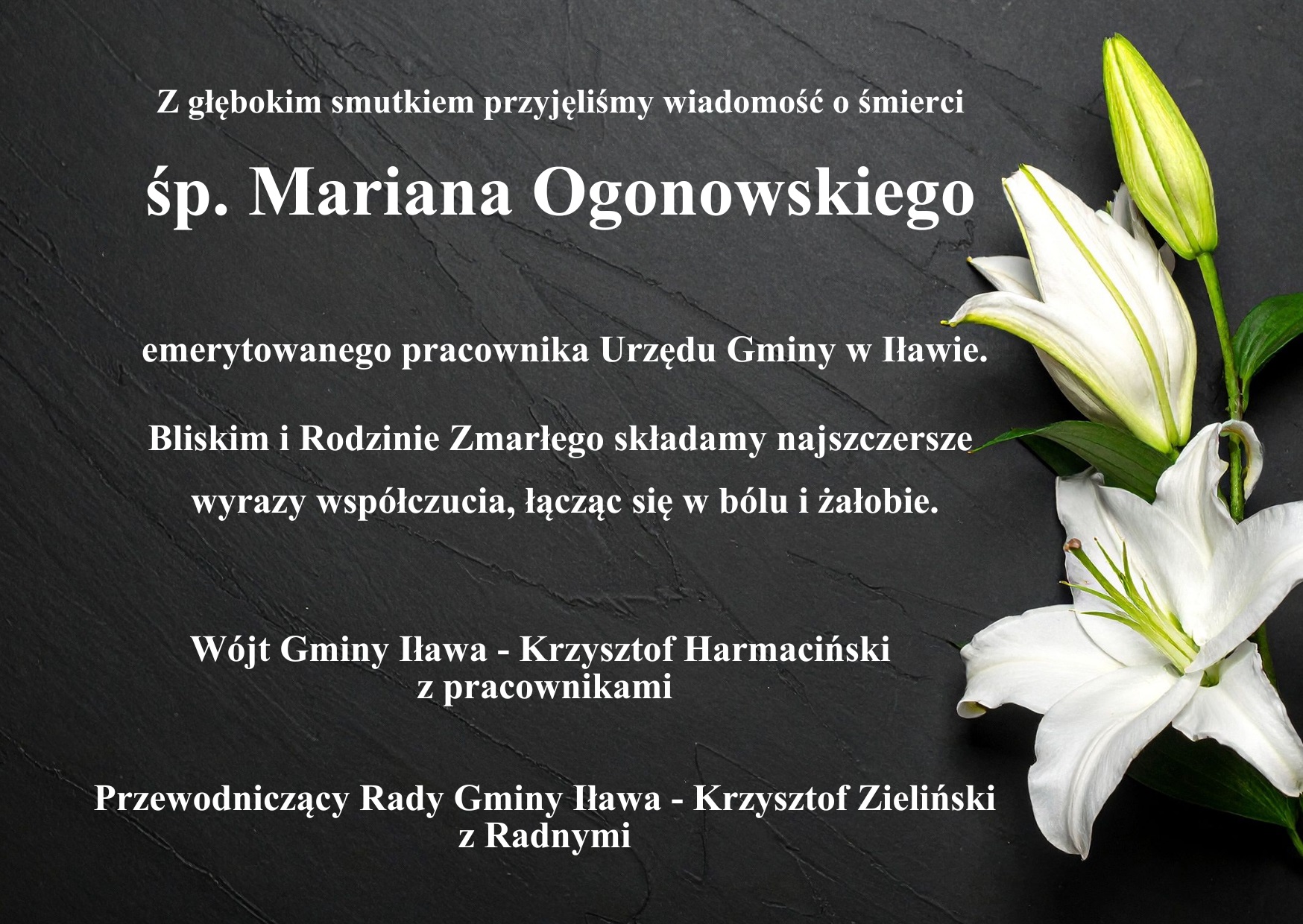 Przedstawiciele samorządu Gminy Iława na czele z Wójtem Krzysztofem Harmacińskim wraz z pracownikami oraz Przewodniczącym Rady Gminy Krzysztofem Zielińskim wraz z Radnymi z głębokim smutkiem przyjęli wiadomość o śmierci śp. Mariana Ogonowskiego - emerytowanego pracownika Urzędu Gminy w Iławie. Najbliższym Zmarłego przekazują najszczersze wyrazy współczucia, łącząc się w bólu i żałobie.