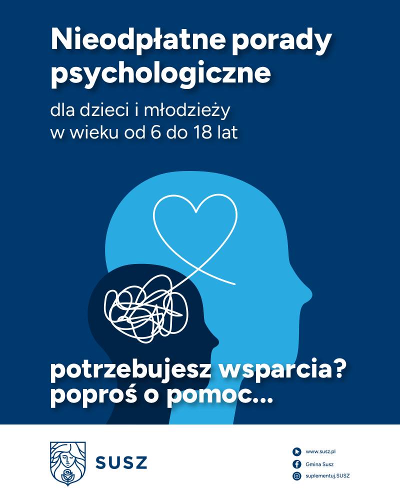 Przypominamy, że na terenie Gminy Susz dostępna jest BEZPŁATNA pomoc psychologiczna dla dzieci i młodzieży w wieku od 6 do 18 lat, którą można uzyskać w każdy piątek w godz. od 14:00 do 18:00 po wcześniejszej rejestracji pod nr. tel. 504 126 759.