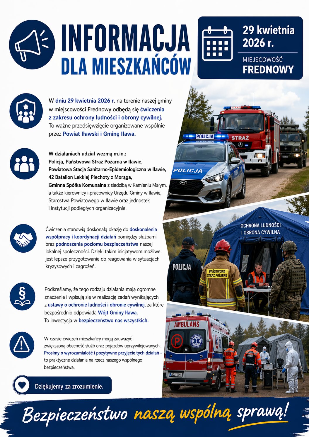 W czasie ćwiczeń mieszkańcy mogą zauważyć zwiększoną obecność służb oraz pojazdów uprzywilejowanych. Organizatorzy proszą o wyrozumiałość i pozytywne przyjęcie tych działań i dziękują za zrozumienie – jak podkreślają, to praktyczne działania na rzecz naszego wspólnego bezpieczeństwa.