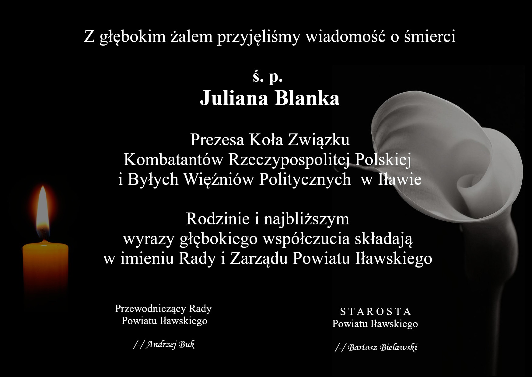 22 kwietnia zmarł, przeżywszy 95 lat, śp. JULIAN BLANK – prezes Koła Związków Kombatantów RP i Byłych Więźniów Politycznych w Iławie. Dzisiaj odbyły się uroczystości pogrzebowe. Rodzinie i najbliższym wyrazy głębokiego współczucia składają w imieniu Rady i Zarządu Powiatu Iławskiego Przewodniczący Rady Powiatu Iławskiego Andrzej Buk i Starosta Powiatu Iławskiego Bartosz Bielawski.