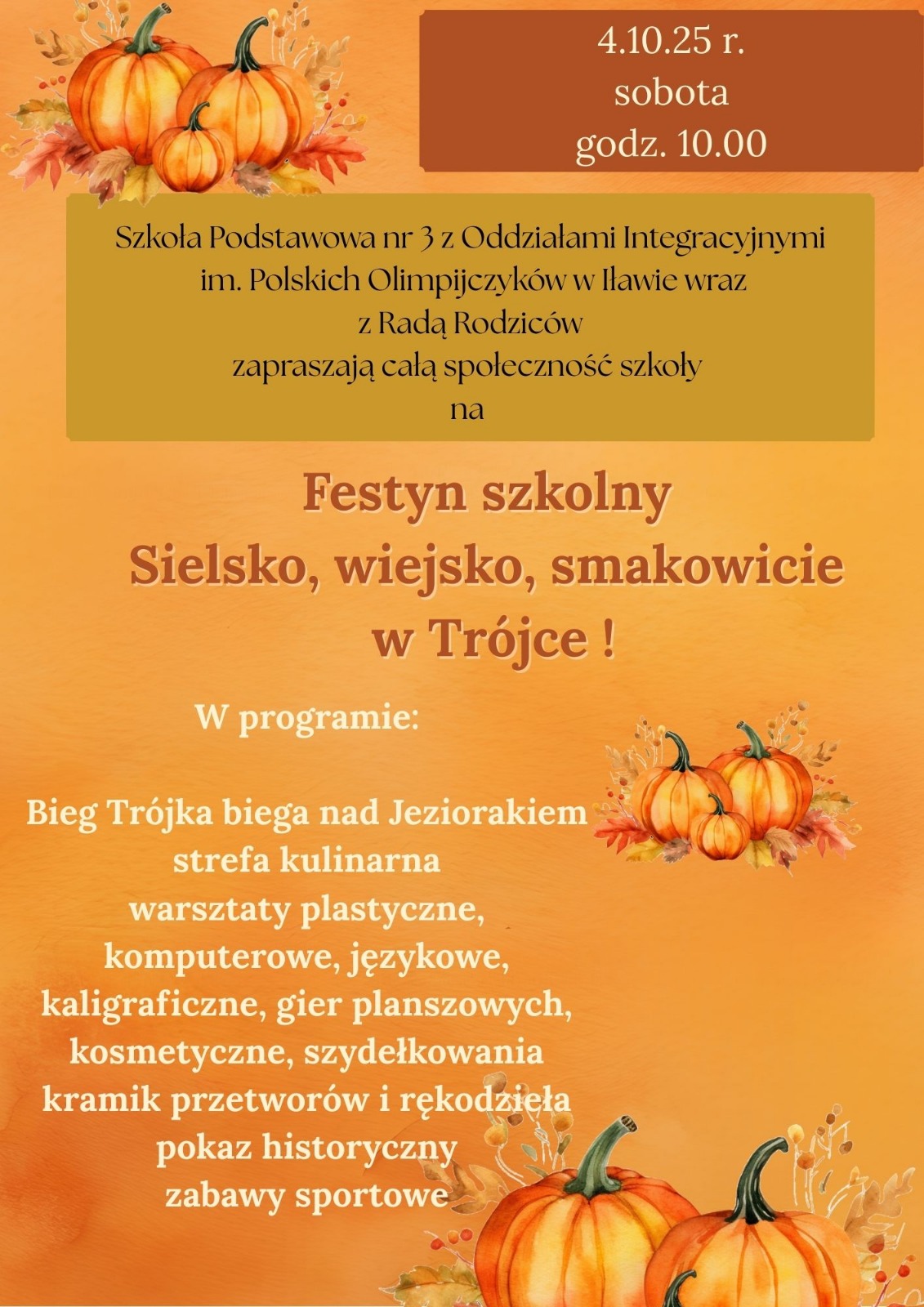 W najbliższą sobotę, 4 października o godzinie 10:00, Szkoła Podstawowa nr 3 z Oddziałami Integracyjnymi im. Polskich Olimpijczyków w Iławie wspólnie z Radą Rodziców zapraszają całą społeczność szkolną, mieszkańców i sympatyków placówki na wyjątkowe wydarzenie – festyn „Sielsko, wiejsko, smakowicie w Trójce”.