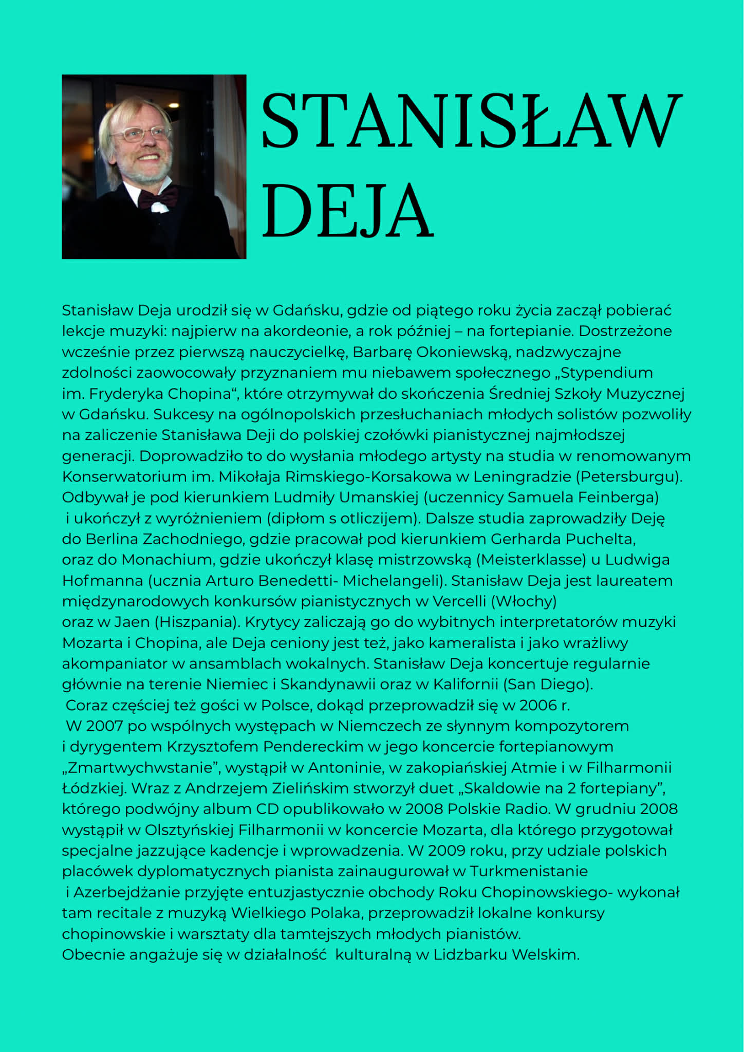 Będzie można posłuchać interpretacji utworów słynnego polskiego kompozytora w wykonaniu laureata międzynarodowych konkursów pianistycznych. Urodzony w Gdańsku pianista to absolwent Średniej Szkoły Muzycznej w Gdańsku, a także renomowanego Konserwatorium im. Mikołaja Rimskiego-Korsakowa w Leningradzie (Petersburgu) oraz klasy mistrzowskiej u Ludwiga Hofmanna w Monachium.